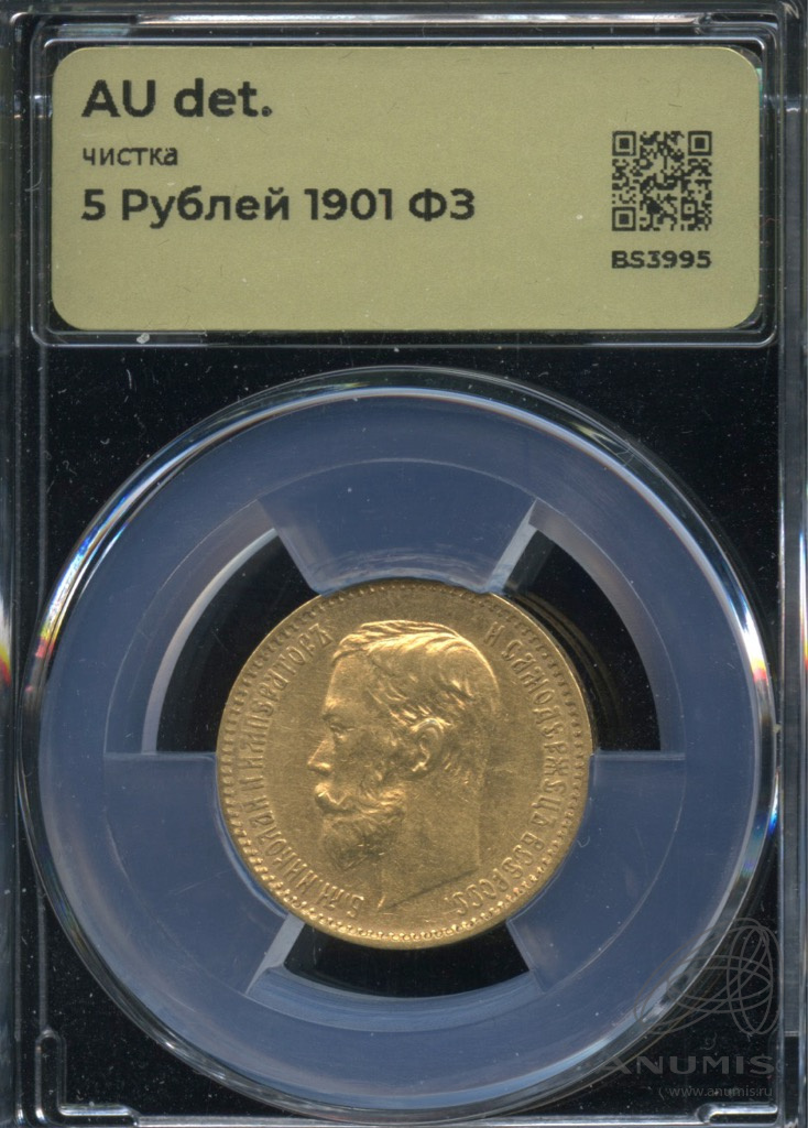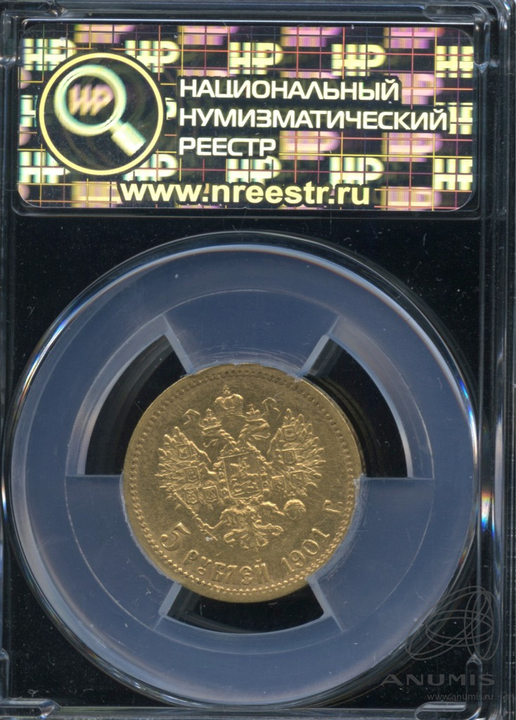 Монета регулярного выпуска: 5 рублей 1901 года «Портрет Николая II». 5 рублей 1897 — 1911 гг. Российская Империя: Николай II (1894 — 1917). Минцмейстер: Феликс Давидович Залеман (1899−1901). Золото 900, 4 г, ø 19 мм, Гурт: Узор. Тираж: 7500022 шт.